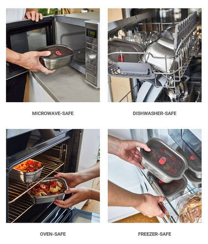 This microwavable steel food box set is lightweight, airtight and durable. It is perfect for meal prep, food storage, or simply eating on-the-go. It is also leak proof, dishwasher and oven-safe, and comes in a small, medium, and large size for breakfast, lunch, and everything in between.