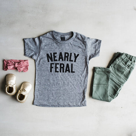 "Nearly Feral" For the wild child who is just barely domesticated enough to live inside your home! This sarcastic, super-soft tee for kids was made in the USA, designed with love, and screen printed by hand in-house.