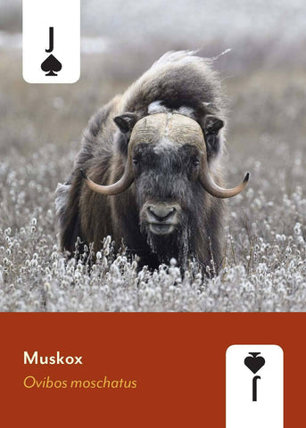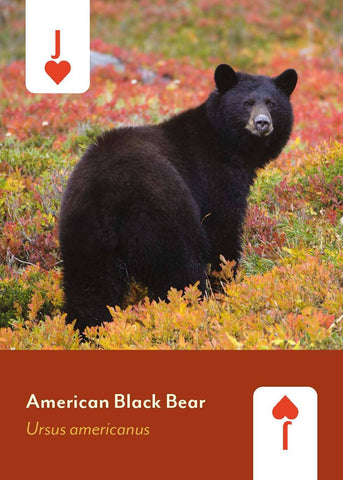 Each suit represents mammals from a different habitat area: hearts are forests and lowlands; clubs are deserts and plains; diamonds explore the mammals of rivers, wetlands, and seas; and spades explore mountains and tundra. Mammals include popular species like the Arctic fox, California sea lion, armadillo, porcupine, bears, deer, and more.